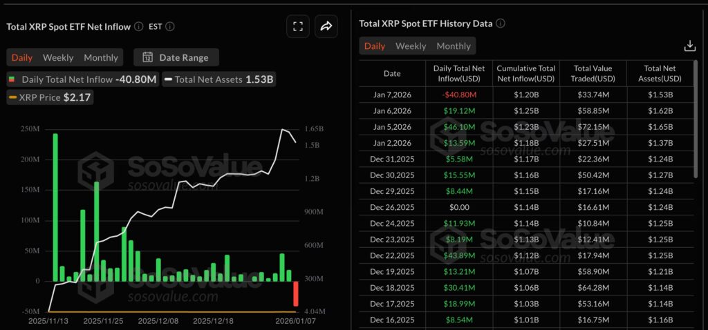 Os fundos registraram saídas de US$ 40,8 milhões em 7 de janeiro, de acordo com dados rastreados pela SoSoValue. O desempenho do dia marcou uma mudança notável após quase dois meses de ganhos ininterruptos que ajudaram a impulsionar os influxos acumulados para US$ 1,2 bilhão e os ativos líquidos totais para cerca de US$ 1,53 bilhão, aproximadamente 1,16% da capitalização de mercado do XRP.